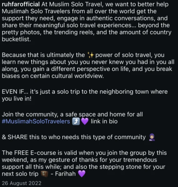 Ever since our establishment, we have constantly engaged in dialogues about this with relevant parties in the tourism industry / Halal events on how times have changed. We have also been loud on SEO (Search Engine Optimization – pre-AI days) and socials on this, as we are the ambassador for Muslimah Solo Travelers.